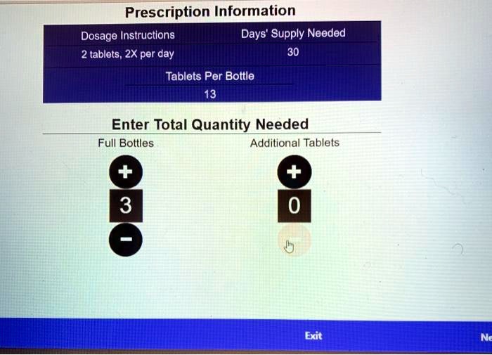 Source: https://www.numerade.com/ask/question/prescription-information-dosage-instructions-days-supply-needed-2-tablets-2x-por-day-tablets-per-bottle-13-enter-total-quantity-needed-full-bottles-additional-tablets-3-2-0-exxt-31008/